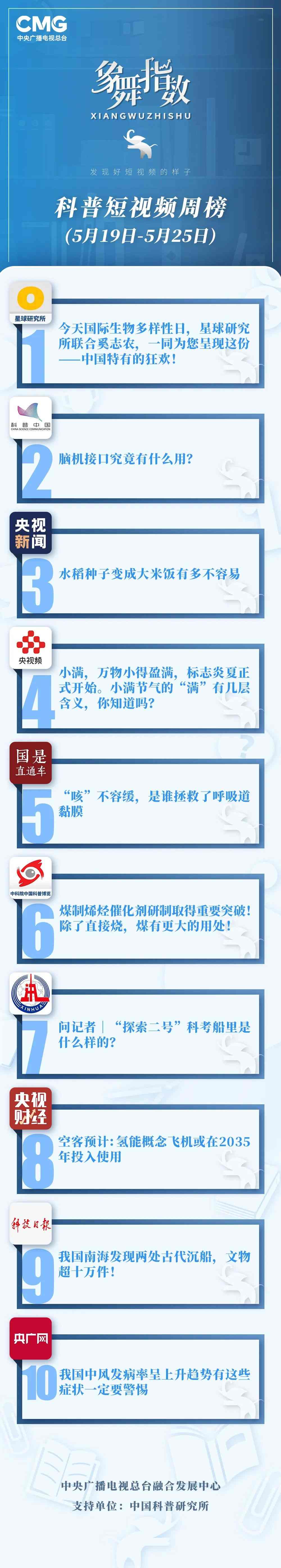 中央廣播電視總臺(tái)“象舞指數(shù)”評議品牌,推出科普短視頻周榜、總臺(tái)科普短視頻周榜。在2023年5月19日-5月25日,值得注目的內(nèi)容有: