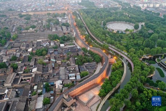 游客在平遙古城城墻上游覽(5月30日攝,無人機照片)。