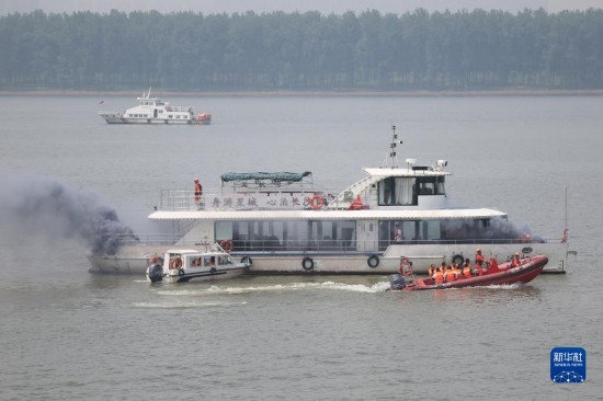 6月2日,在水域救援實戰(zhàn)演習(xí)現(xiàn)場,消防救援人員駕駛快艇模擬救援事故船上的遇險群眾。