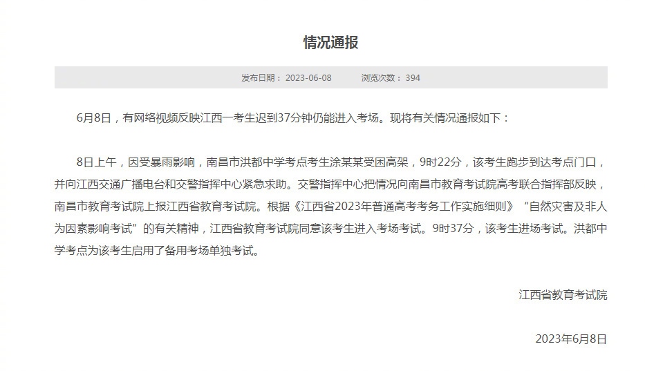 ·江西省教育考試院通報(bào)“一考生遲到37分鐘仍能進(jìn)入考場”。