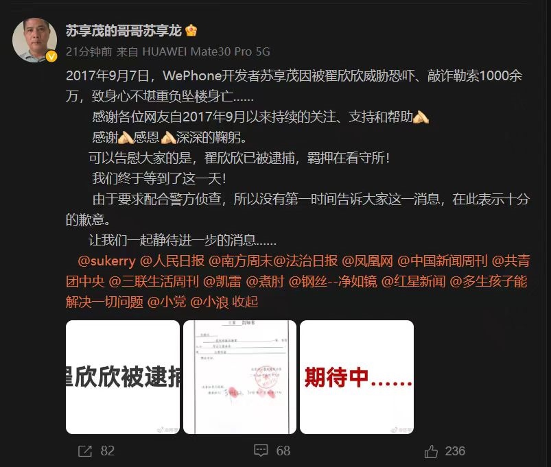 事發(fā)5年多之后,2023年6月9日,蘇享茂的哥哥蘇享龍通過個人微博稱,“翟欣欣已被逮捕,羈押在看守所?!碧K享龍?zhí)峁┑募由w北京海淀區(qū)公安局公章的立案通知書顯示,翟欣欣敲詐勒索一案,該局認為符合立案條件,現立案偵查。