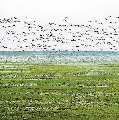 順著他手指的方向,只見大大小小的灘涂上,有黑點和白點在移動。通過望遠鏡一看,竟是一群群水鳥。水草在清澈的湖中搖曳,有的已經(jīng)高出了水面。