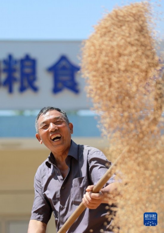 6月9日,山東省聊城市茌平區(qū)賈寨鎮(zhèn)賈寨前村的農(nóng)民在揚(yáng)曬小麥。