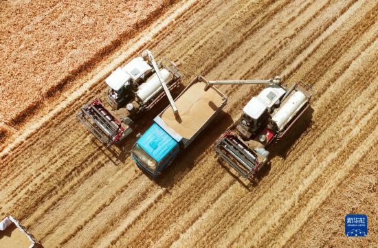 6月9日,河南省開(kāi)封市尉氏縣十八里鎮(zhèn)的機(jī)收服務(wù)隊(duì)幫助村民收獲小麥。