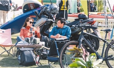 2023淀山湖(昆山)國際露營節(jié)在江蘇省昆山市舉行。露營節(jié)涵蓋露營裝備展、飛盤活動以及露營派對等內容,滿足露營愛好者的多樣需求。圖為兩名游客在露營裝備展區(qū)交流。唐旭騁攝(人民視覺)