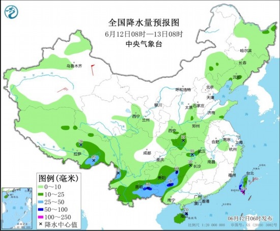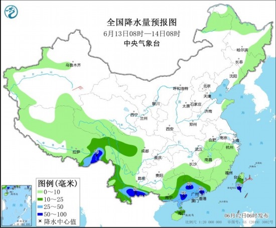 圖2 全國降水量預報圖(6月12日08時-13日08時) 圖片來源:中央氣象臺網(wǎng)站