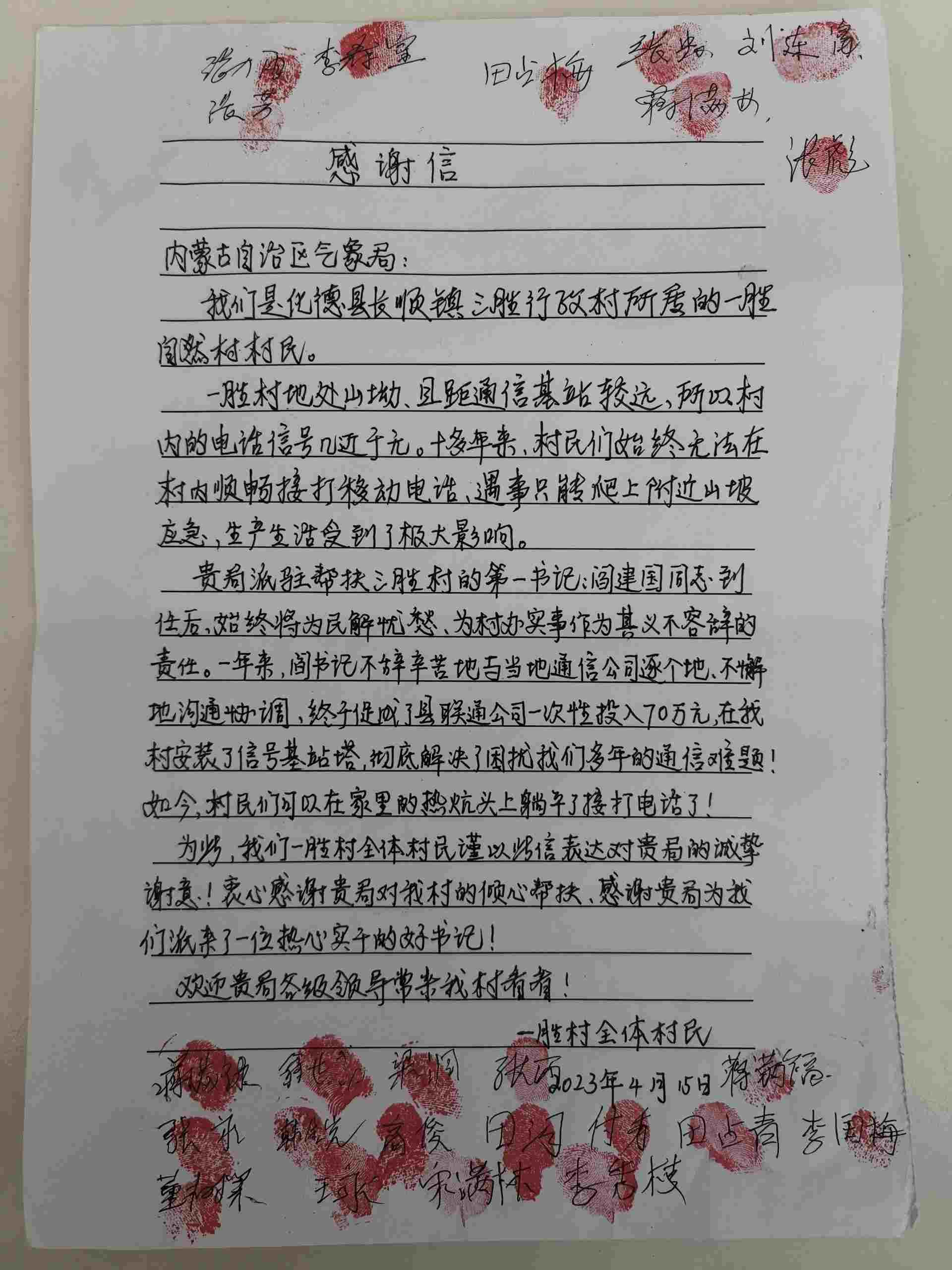 近日,一封署名為“一勝村全體村民”的感謝信,被專程送至內(nèi)蒙古氣象局,信紙上的空白處簽滿了24個(gè)名字,還有一枚枚鮮紅的指印,這封信承載著烏蘭察布市化德縣一勝村16戶村民對(duì)駐村第一書(shū)記閻建國(guó)的誠(chéng)摯謝意。