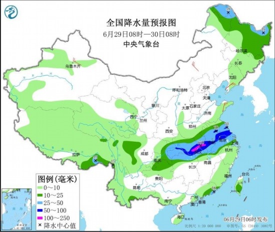 圖1 全國強降雨落區(qū)預報圖(6月29日08時-30日08時) 圖自中央氣象臺網(wǎng)站