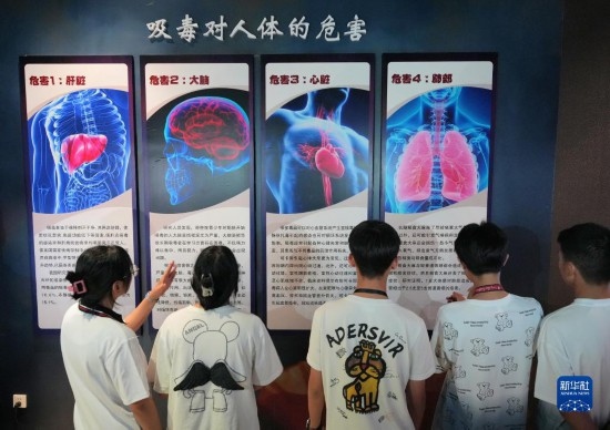 6月25日,高中生在山東省煙臺市牟平區(qū)禁毒教育基地了解吸毒對人體的危害。
