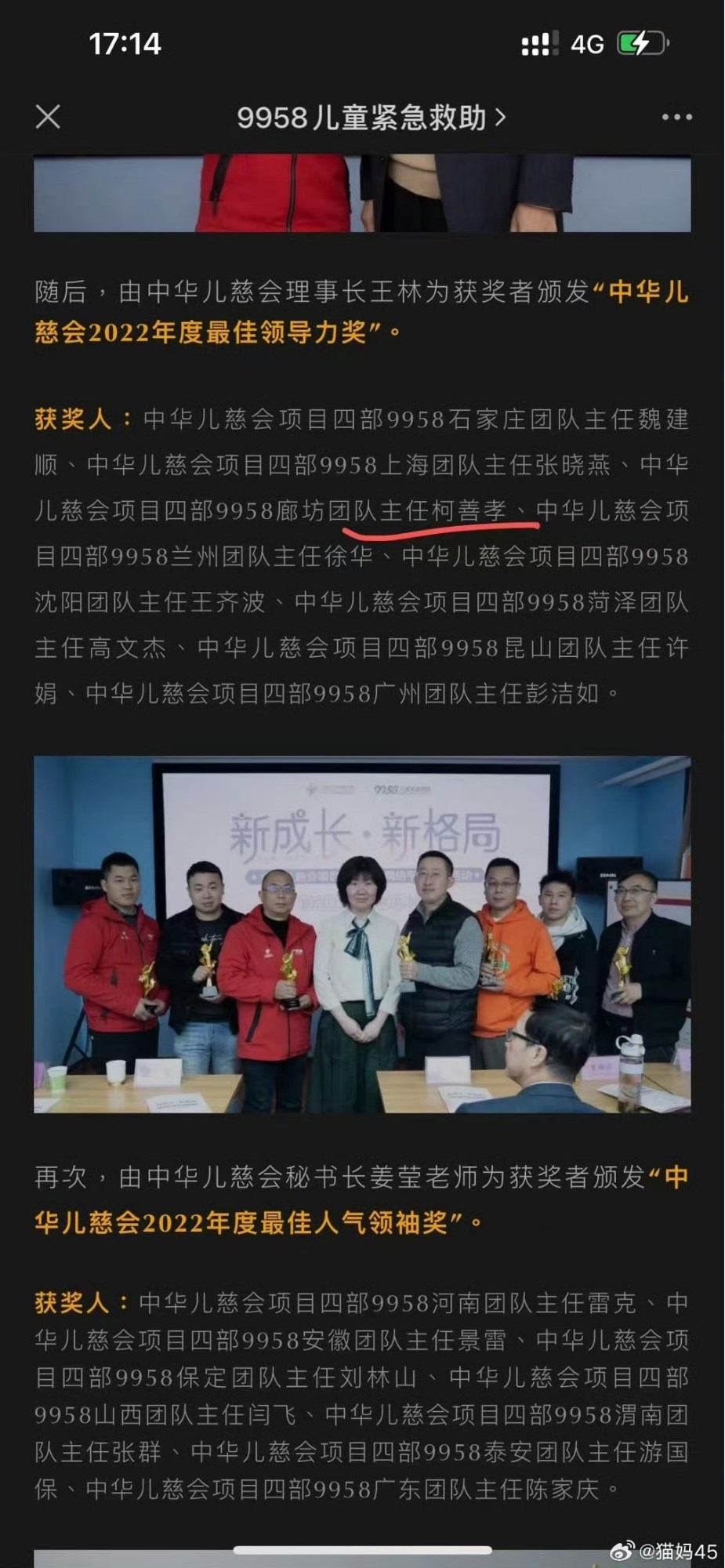但對這份聲明,被騙家屬們并不認同。首先是涉案人員柯某孝的身份問題,此前中華兒慈會官方公眾號顯示,柯某孝為“中華兒慈會項目四部9958廊坊團隊主任”,獲“中華兒慈會2022年度最佳領(lǐng)導(dǎo)力獎”。目前,中華兒慈會官方公眾號文章已對這些內(nèi)容進行修改或刪除。