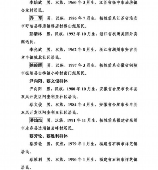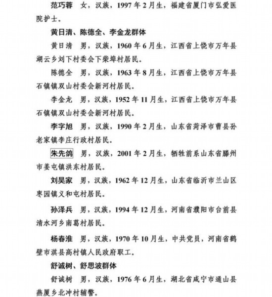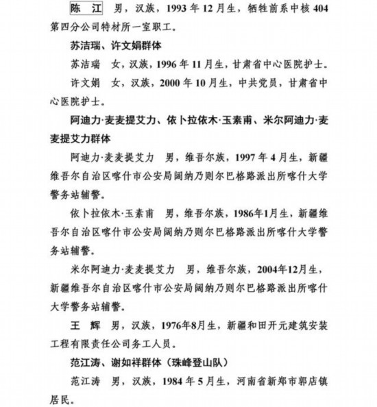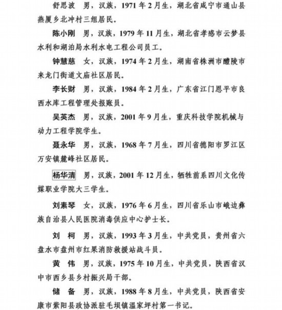 上榜勇士中,有從高橋上跳水救人導致胸椎骨折的外賣小哥彭清林和另一位高橋跳水救人的中學教師丁成闖;有冒著9級大風在海上營救遇險臺胞的漁民蔡芳輪、蔡勝利;有放棄登頂珠峰機會而救助同胞的珠峰登山隊隊員范江濤、謝如祥;有萬米高空機艙里搶救瀕危病人的護士長劉素琴;有勇斗盜賊被刺幾刀仍不退縮的江蘇村民李培武;有身患癌癥卻橫渡淥江河救人的樂觀大姐鐘慧慈;有跳進充滿沼氣深井救人致多器官感染的山東小伙李字旭;更有冒死救援落水群眾壯烈犧牲的潘燦燦、朱先鴿、尹新朋、喬軍、徐毅暉、楊華清、陳江七位勇士,讓我們致以最崇高的敬意!