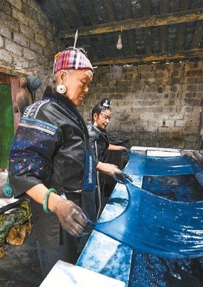 在貴州省臺江縣萃文街道仰黎坊,苗繡傳承人潘玉珍(前)與女兒在染布。