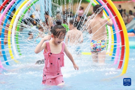 7月8日,小朋友在貴州省鎮(zhèn)遠縣羊坪鎮(zhèn)一家水上游樂園戲水游玩。