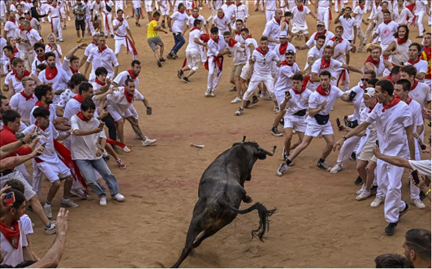 當(dāng)?shù)貢r(shí)間2023年7月10日,西班牙潘普洛納,圣費(fèi)爾明節(jié)期間,狂歡者站在公牛周?chē)?,公牛進(jìn)入斗牛場(chǎng)。