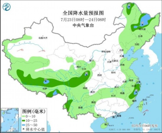 7月23日08時(shí)至24日08時(shí),西藏中部、川西高原北部、甘肅南部、黑龍江西北部和中部、吉林西部、浙江東部、福建北部、云南西北部等地部分地區(qū)有中到大雨(25~45毫米)。新疆南疆盆地部分地區(qū)有4~6級風(fēng)(見圖4)。