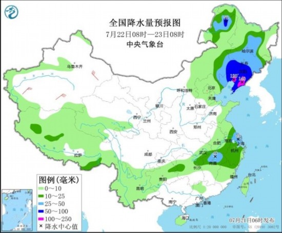 7月22日08時(shí)至23日08時(shí),內(nèi)蒙古東部、東北地區(qū)大部、江淮東部、江南東北部等地部分地區(qū)有中到大雨,其中,內(nèi)蒙古東南部、吉林南部、遼寧大部等地部分地區(qū)有暴雨或大暴雨(100~140毫米)。新疆南疆盆地和東部等地部分地區(qū)有4~6級風(fēng)(見圖3)。