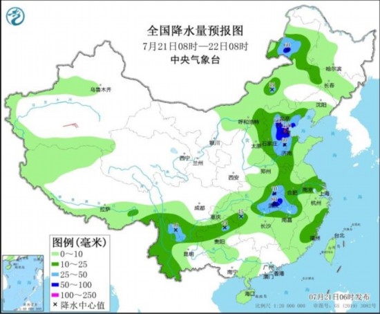 預(yù)計(jì),7月21日08時(shí)至22日08時(shí),內(nèi)蒙古東北部、河北東部、北京、天津、山東西北部、河南東南部、湖北東部、江西北部、四川南部等地部分地區(qū)有大到暴雨,其中,河北中部、北京東南部、天津南部等地局地有大暴雨(100~130毫米)。上述部分地區(qū)伴有短時(shí)強(qiáng)降水(最大小時(shí)降雨量20~50毫米,局地可超過60毫米),局地有雷暴大風(fēng)等強(qiáng)對流天氣。中央氣象臺7月21日06時(shí)繼續(xù)發(fā)布暴雨藍(lán)色預(yù)警。