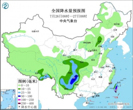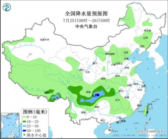 預(yù)計,7月24日08時至25日08時,四川盆地中南部、重慶大部、貴州北部、云南東北部、湖北西南部、湖南西北部以及浙江南部、福建中北部、江西南部、黑龍江北部、西藏東部等地部分地區(qū)有大到暴雨,其中,重慶南部等地局部地區(qū)有大暴雨(100~140毫米)。上述部分地區(qū)伴有短時強(qiáng)降水(最大小時降雨量30~50毫米,局地可超過70毫米),局地有雷暴大風(fēng)等強(qiáng)對流天氣。中央氣象臺7月24日06時繼續(xù)發(fā)布暴雨藍(lán)色預(yù)警。