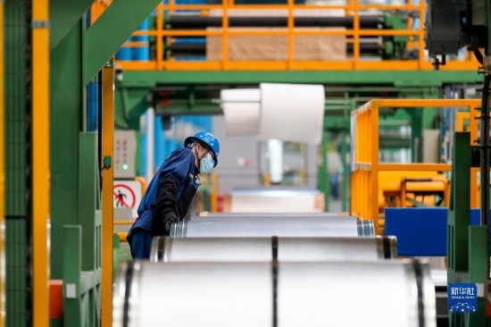 工人在首鋼智新遷安電磁材料有限公司電工鋼產(chǎn)品包裝線上巡檢(2023年4月19日攝)。新華社記者 牟宇 攝
