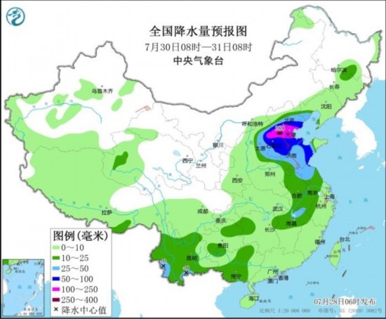 7月30日08時(shí)至31日08時(shí),華北中東部、黃淮東部、江淮中東部、江南北部、西南地區(qū)東部和南部等地的部分地區(qū)有中到大雨,其中,北京南部、天津、河北大部、山東中西部等地部分地區(qū)有暴雨或大暴雨,河北中部等地局地特大暴雨(250~280毫米)。新疆東部、河北南部、浙江北部等地部分地區(qū)有4~6級(jí)風(fēng)。