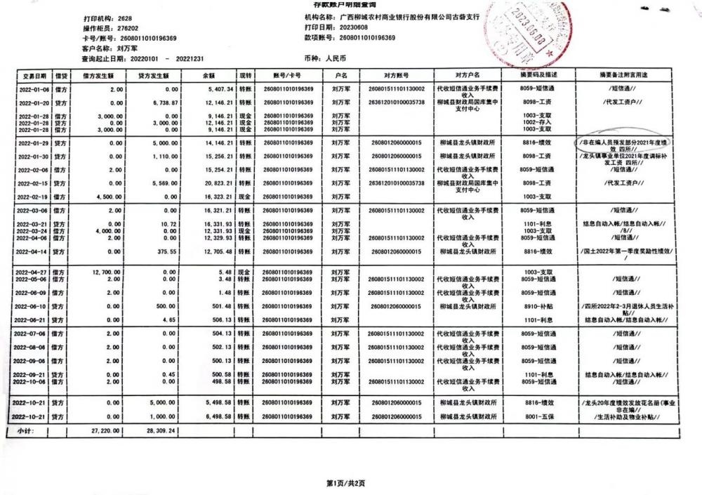 劉萬軍的銀行流水上注明了“非在編人員”。圖/劉萬軍提供