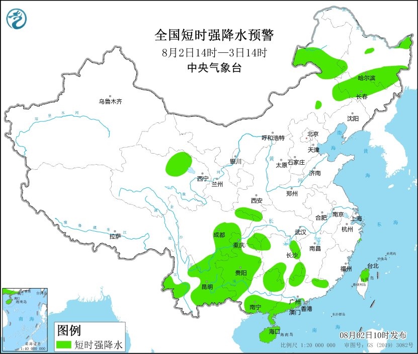 預(yù)計8月2日14時至3日14時,內(nèi)蒙古東南部和中部、黑龍江東南部、吉林中西部、遼寧西北部、河北北部、臺灣島北部等地的部分地區(qū)將有8-10級雷暴大風(fēng)或冰雹天氣;內(nèi)蒙古東部、黑龍江東部和南部、吉林中西部、青海北部、陜西南部、湖南東部和西部、四川東部和南部、重慶西部和東南部、貴州大部、云南東部和西部、廣西南部和西部、廣東北部和西南部、海南島、臺灣島北部等地的部分地區(qū)將有短時強降水天氣,小時雨量30-50毫米,局地可達60毫米以上。