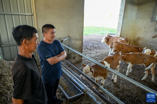8月3日,在扎魯特旗巨日合鎮(zhèn),百順養(yǎng)殖專業(yè)合作社負(fù)責(zé)人楊紹武(右)和養(yǎng)殖戶李和查看牛犢繁育情況。