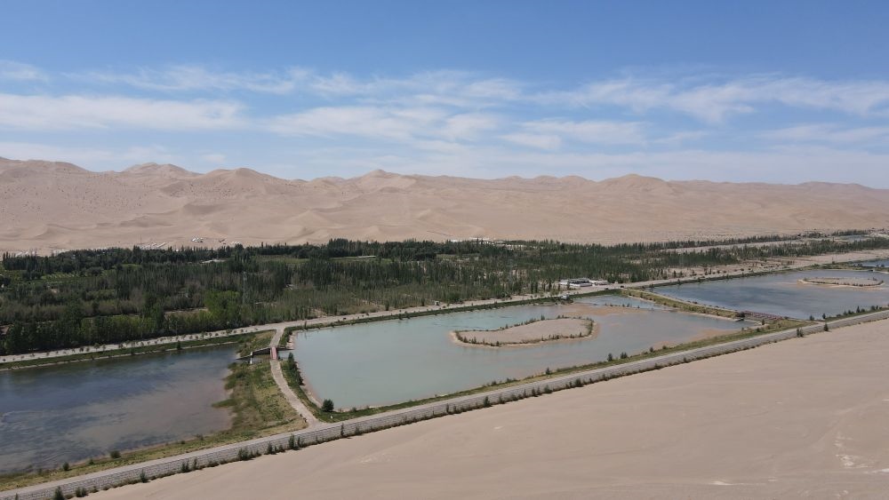 在距離月牙泉5公里的地方,有一處人稱“十二連湖”的景觀。十二個人工水池宛若明鏡,倒映藍天,時有水鳥掠過。