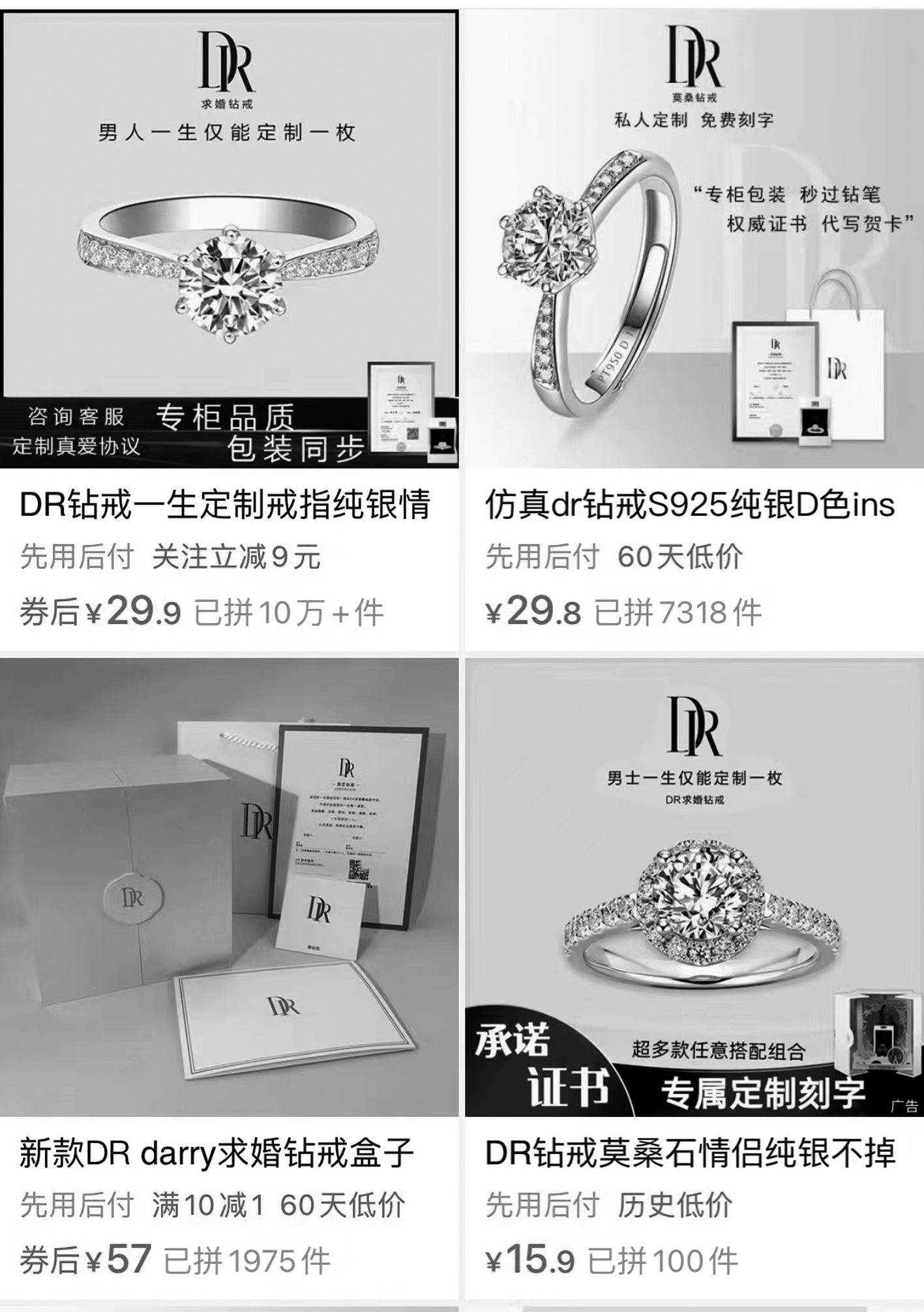 記者在一家電商平臺(tái)輸入“DR鉆戒”,映入眼簾的商品售價(jià)只要幾十塊,幾乎都把“男士一生僅能定制一枚”作為賣點(diǎn)。還有商家寫(xiě)道,“專柜品質(zhì)、包裝同步”“咨詢客服定制真愛(ài)協(xié)議”。