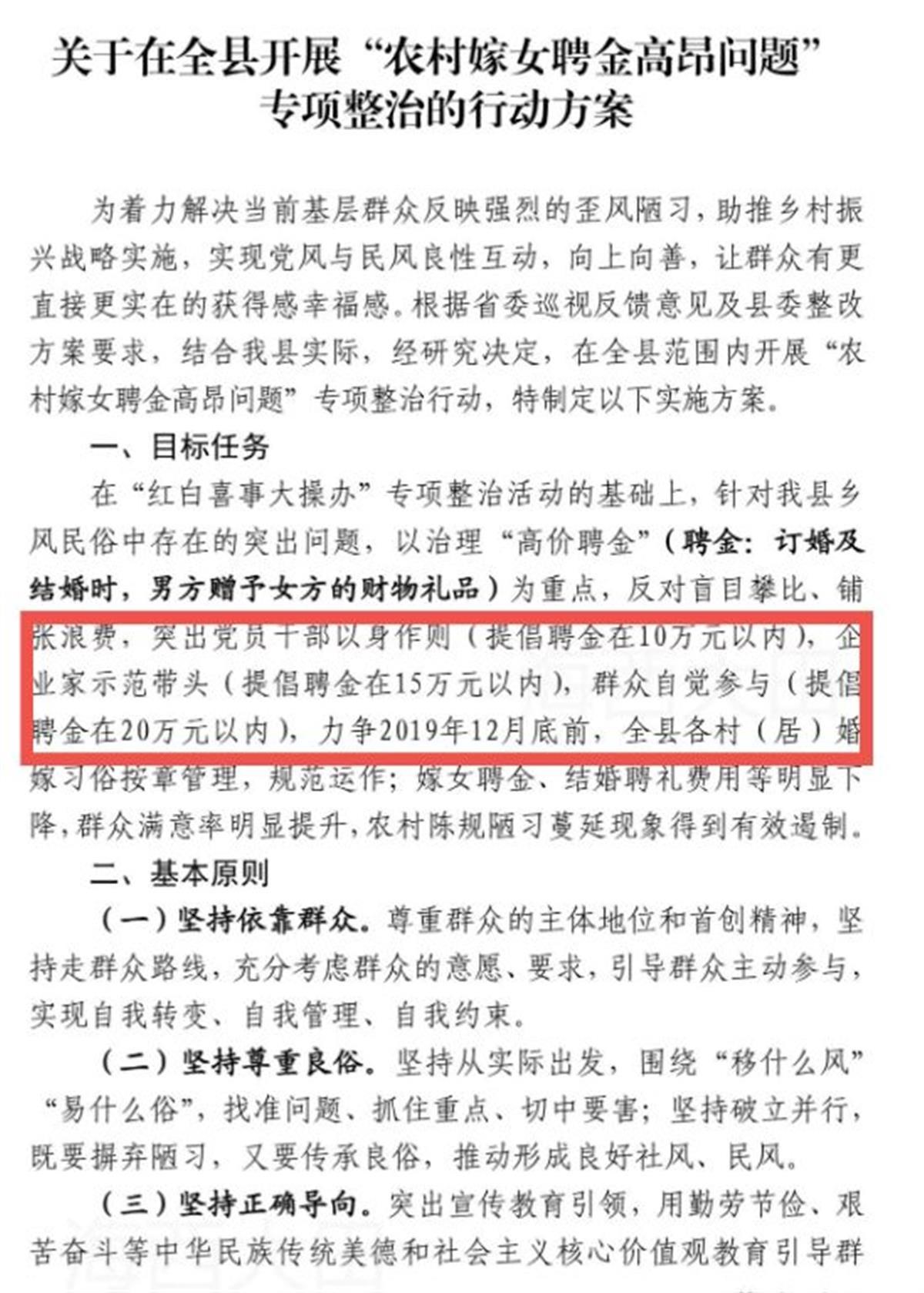 2019年5月,大田縣委辦公室就印發(fā)《關(guān)于在全縣開展“農(nóng)村嫁女聘金高昂?jiǎn)栴}”專項(xiàng)整治的行動(dòng)方案》的通知。方案內(nèi)容有,針對(duì)該縣鄉(xiāng)風(fēng)民俗中存在的突出問題,以治理“高價(jià)聘金”為重點(diǎn),反對(duì)盲目攀比、鋪張浪費(fèi),突出黨員干部以身作則(提倡聘金在10萬元以內(nèi)),企業(yè)家示范帶頭(提倡聘金在15萬元以內(nèi)),群眾自覺參與(提倡聘金在20萬元以內(nèi)),力爭(zhēng)在2019年12月底前,結(jié)婚聘禮費(fèi)用等明顯下降。