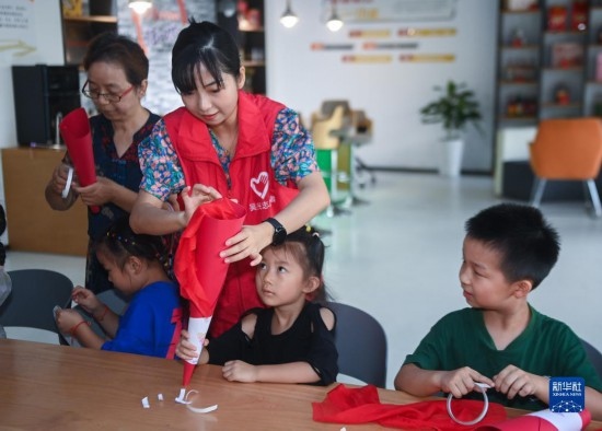8月24日,在湖州市龍泉街道白魚(yú)潭社區(qū)新時(shí)代文明實(shí)踐站,黨員志愿者教孩子們制作手工火炬。