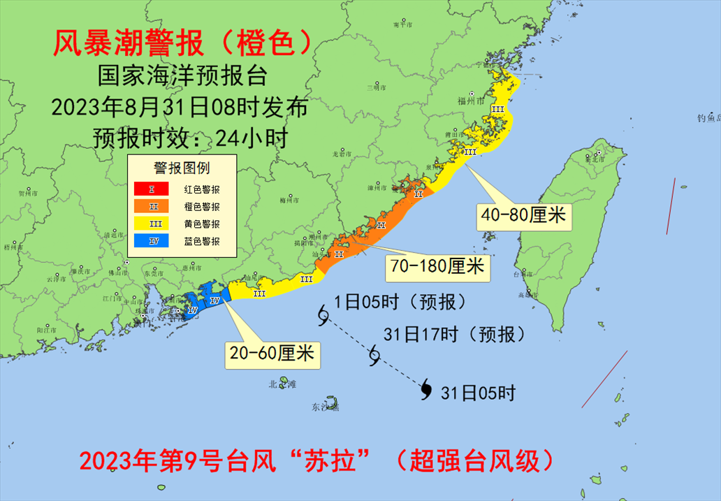 預計8月31日上午至9月1日中午,福建福州至泉州沿海將出現(xiàn)40到80厘米的風暴增水,福建廈門至廣東汕尾沿海將出現(xiàn)70到180厘米的風暴增水,廣東惠州和深圳沿海將出現(xiàn)20到60厘米的風暴增水。福建省廈門市、漳州市、廣東省潮州市和汕頭市的風暴潮預警級別為橙色,福建省福州市、莆田市、泉州市、廣東省揭陽市和汕尾市的風暴潮預警級別為黃色。