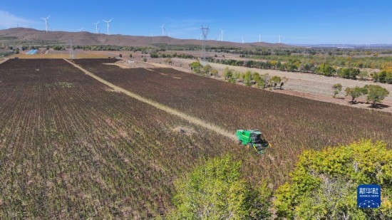 10月1日,在沽源縣白土窯鄉(xiāng)小西溝村,當(dāng)?shù)剞r(nóng)機手在田間操作收割機收獲藜麥(無人機照片)。