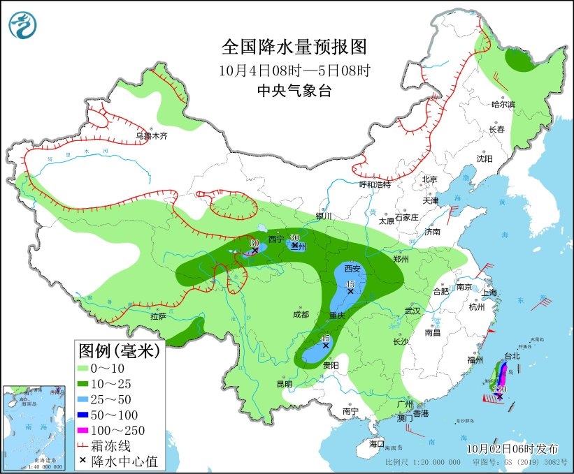 10月4日08時至5日08時,西藏東南部、青海中東部、甘肅中南部等地部分地區(qū)有中到大雪或雨夾雪,局地有暴雪。黑龍江北部、陜西中南部、四川東部、重慶、貴州西部、湖北西北部、河南西部以及臺灣島大部等地部分地區(qū)有中到大雨,其中,臺灣島東部和南部等地部分地區(qū)有暴雨或大暴雨(100~220毫米)。內(nèi)蒙古中部、黑龍江西南部、山東中部等地部分地區(qū)有4~6級風。渤海、渤海海峽、黃海大部、東海北部將有6~7級風、陣風8級,東海西南部海域風力將有7~8級風、陣風9級。臺灣以東洋面將有12~14級風、陣風15級,臺灣海峽將有10~12級風、陣風13級,巴士海峽將有11~12級風、陣風13級(見圖3)。