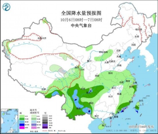 全國降水量預報圖(10月5日08時-6日08時)
