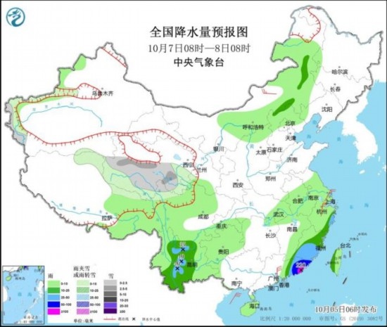 10月7日08時至8日08時,青海南部、西藏北部有小雪或雨夾雪,浙江東部、福建南部、云南中西部、廣東東部等地部分地區(qū)有大到暴雨,其中,廣東東部等地部分地區(qū)有大暴雨(100~220毫米)。內(nèi)蒙古中部、浙江北部、廣東中部等地部分地區(qū)有4~6級風。東海西南部海域、臺灣海峽、南海東北部海域有7~9級風、陣風10~11級,其中臺灣海峽部分海域風力可達10~12級。