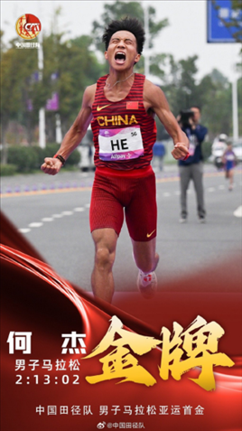 創(chuàng)造歷史!5日的杭州亞運(yùn)會馬拉松賽場上,中國選手何杰勇奪金牌,這是中國隊在亞運(yùn)史上首次獲得男子馬拉松金牌。