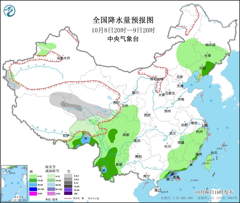 10月6日20時(shí)至7日20時(shí),新疆南疆盆地西部沿山地區(qū)、青海南部、西藏東部等地有小到中雪或雨夾雪;西藏東南部、四川盆地東部和南部、云南中東部、福建中南部、廣東東部、海南島南部、臺(tái)灣島西部等地部分地區(qū)有中到大雨,其中,廣東東部和福建南部沿海等地局部地區(qū)有暴雨(50~65毫米)。內(nèi)蒙古中東部、遼東半島、浙江東部沿海等地部分地區(qū)有4~6級(jí)風(fēng),西藏中部部分地區(qū)有6~7級(jí)風(fēng)。臺(tái)灣海峽將有6~7級(jí)、陣風(fēng)8級(jí)的東北風(fēng),南海東北部海域?qū)⒂?~9級(jí)、陣風(fēng)10級(jí)的偏北風(fēng)(見(jiàn)圖1)。
