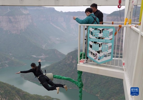 10月19日,游客在河南寶泉旅游度假區(qū)體驗懸崖蹦極項目。