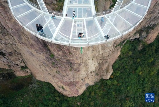 10月19日,游客在河南寶泉旅游度假區(qū)體驗“云崖漫步”項目。