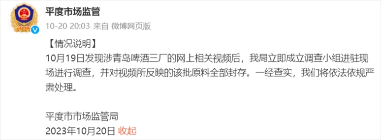 青島啤酒方面在10月20日晚間發(fā)布的回應(yīng)稱,針對(duì)10月19日網(wǎng)上出現(xiàn)的青島啤酒三廠的相關(guān)視頻,公司高度重視,第一時(shí)間向公安機(jī)關(guān)報(bào)警,公安機(jī)關(guān)已介入調(diào)查。目前,該批麥芽已經(jīng)全部封存。公司繼續(xù)加大管理力度,確保產(chǎn)品質(zhì)量,歡迎廣大消費(fèi)者監(jiān)督。