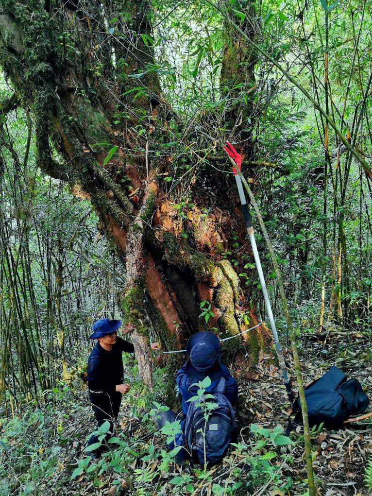 科研人員在對喜馬拉雅紅豆杉進(jìn)行測量。(資料圖片)