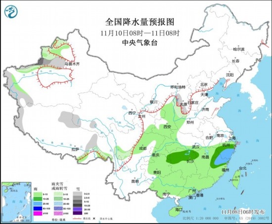 11月10日08時至11日08時,新疆沿天山地區(qū)和南疆西部山區(qū)、山西中部等地部分地區(qū)有小到中雪或雨夾雪,局地大雪。西北地區(qū)東南部、江漢西部、江南、西南地區(qū)東部、華南、臺灣島等地部分地區(qū)有小到中雨,其中,浙江中南部、福建北部等地部分地區(qū)有大雨。遼東半島、山東南部等地部分地區(qū)有4~5級風(見圖4)。