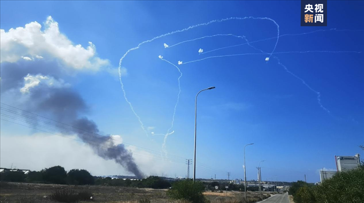 △“鐵穹”攔截瞬間。其中一枚火箭彈未能成功攔截,掉落在阿什凱隆工業(yè)區(qū)。