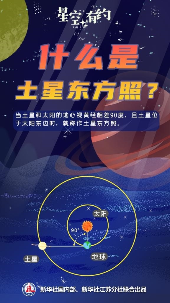 當土星和太陽的地心視黃經(jīng)相差90度,且土星位于太陽東邊時,就稱作土星東方照。如果可以俯視太陽系的平面,此時你會看到太陽、地球、土星形成了一個直角,地球處于直角的頂點。
