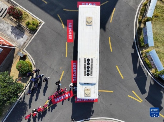 12月1日,在長(zhǎng)沙市望城區(qū)新河學(xué)校,學(xué)生參加汽車(chē)盲區(qū)體驗(yàn)活動(dòng)(無(wú)人機(jī)照片)。