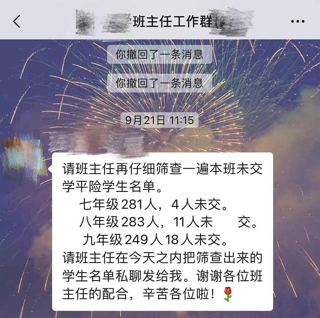她要反復(fù)叮囑學(xué)生,同時(shí)在家長(zhǎng)群一一驗(yàn)收,“力求100%完成”。因?yàn)檫@些任務(wù)大多與她的績(jī)效掛鉤。但并非所有家長(zhǎng)都愿意配合,因?yàn)樾枰_認(rèn)的通知太多,她還為此被家長(zhǎng)告到教育局。