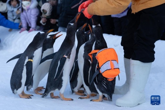 12月3日,哈爾濱極地公園的企鵝在戶外進(jìn)行冰雪巡游。