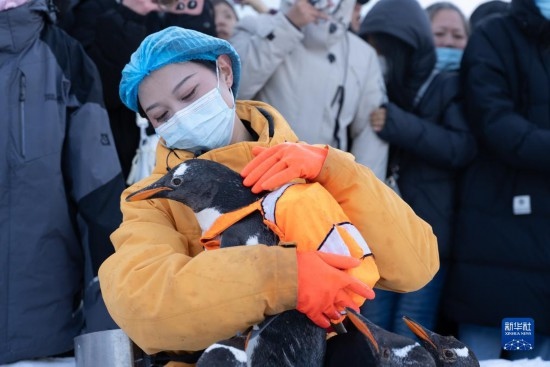 時(shí)值周末,哈爾濱極地公園的企鵝亮相戶外,上演冰雪巡游,吸引許多游客前來(lái)觀賞。目前正是黑龍江省哈爾濱市的冰雪旅游季。