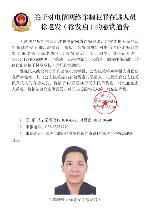 據(jù)了解,今年11月,我公安機(jī)關(guān)對以明學(xué)昌為首的家族犯罪集團(tuán)重要頭目進(jìn)行公開懸賞通緝。在緬甸各方的大力配合下,首犯明學(xué)昌畏罪自殺,明國平、明菊蘭、明珍珍3人被緝拿歸案,公安機(jī)關(guān)正徹查其犯罪事實(shí),將依法予以嚴(yán)懲。與此同時(shí),遼寧、福建、重慶等地公安機(jī)關(guān)在偵查中發(fā)現(xiàn),以白所成、魏懷仁、劉正祥為首的3個(gè)家族犯罪集團(tuán)和以徐老發(fā)為首的犯罪集團(tuán),長期實(shí)施針對中國公民的電信網(wǎng)絡(luò)詐騙犯罪活動,詐騙數(shù)額巨大。在公安機(jī)關(guān)嚴(yán)打高壓態(tài)勢下,仍不收斂、不收手,同時(shí)涉嫌故意殺人、故意傷害、非法拘禁等多種嚴(yán)重暴力犯罪,犯罪事實(shí)清楚,證據(jù)確鑿充分。